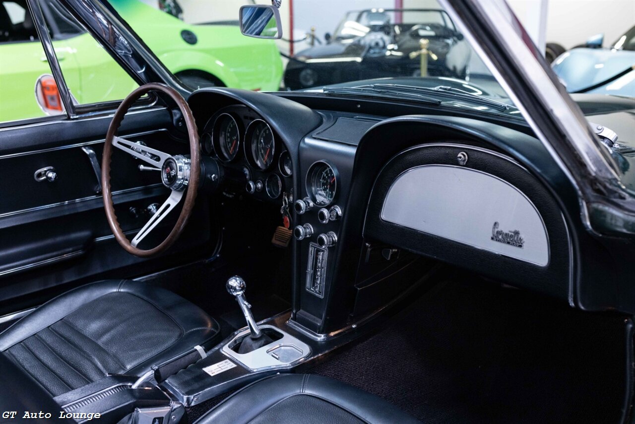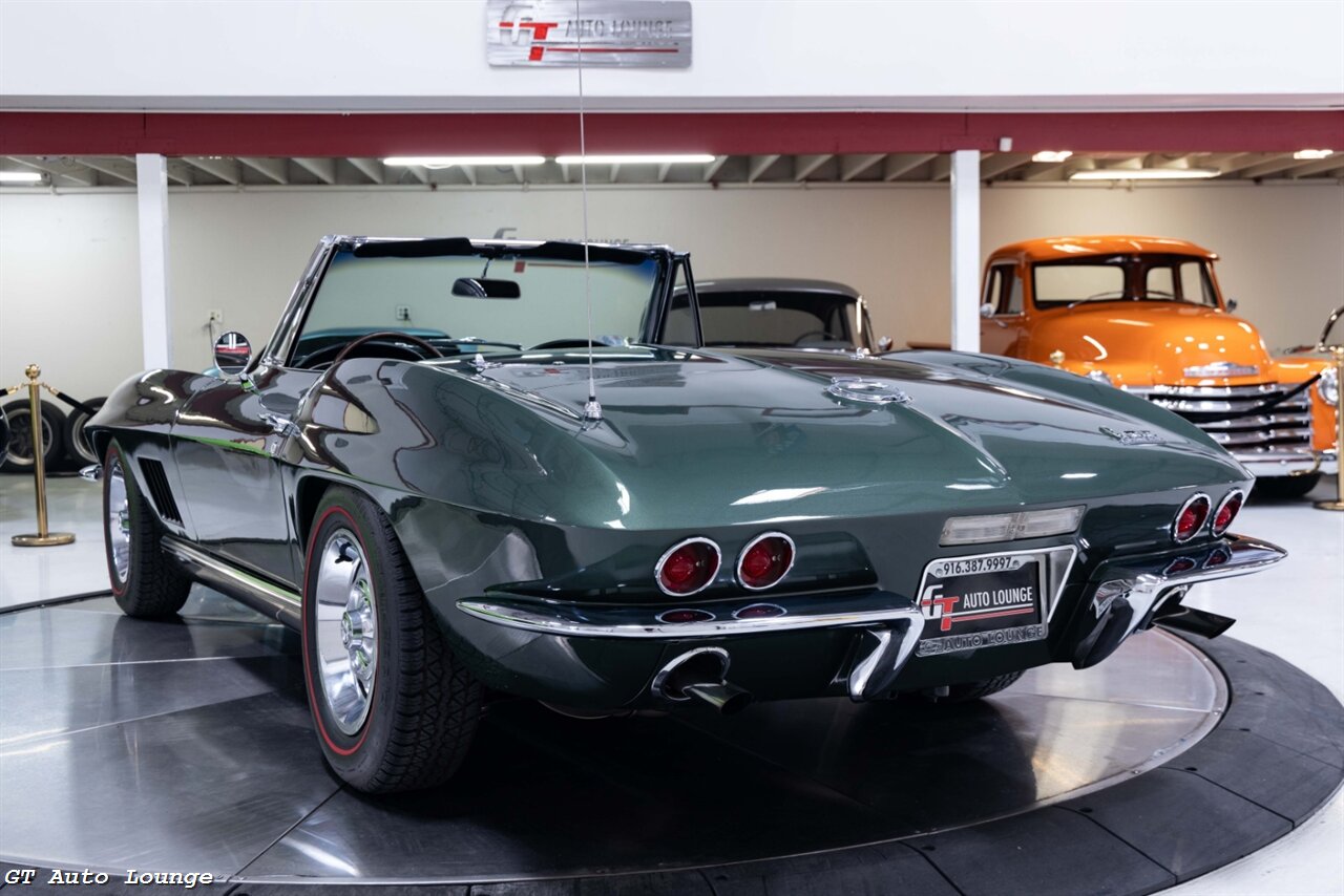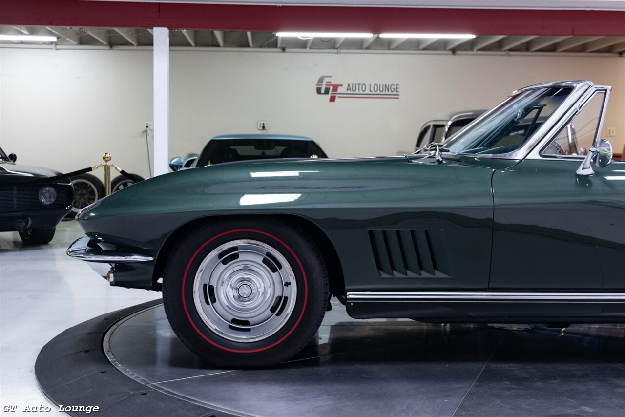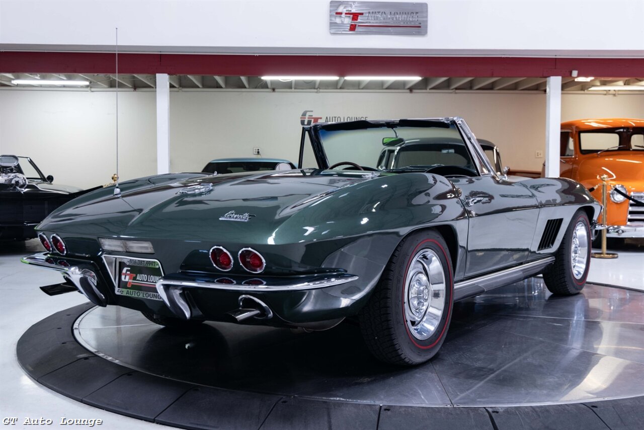 1967 Chevrolet Corvette Convertible in Goodwood Green w/ Black Convertible Top over Black Interior. Equipped with a 327ci L79 V8 mated to a 4 Speed Manual Transmission. Features include: 327ci 350hp V8, Dash Mounted Clock, AM/FM Radio, Rally Wheels, Pop-Up Headlights and more! This stunning C2 Corvette is ready to be driven and enjoyed! For more information please call 916-387-9997.